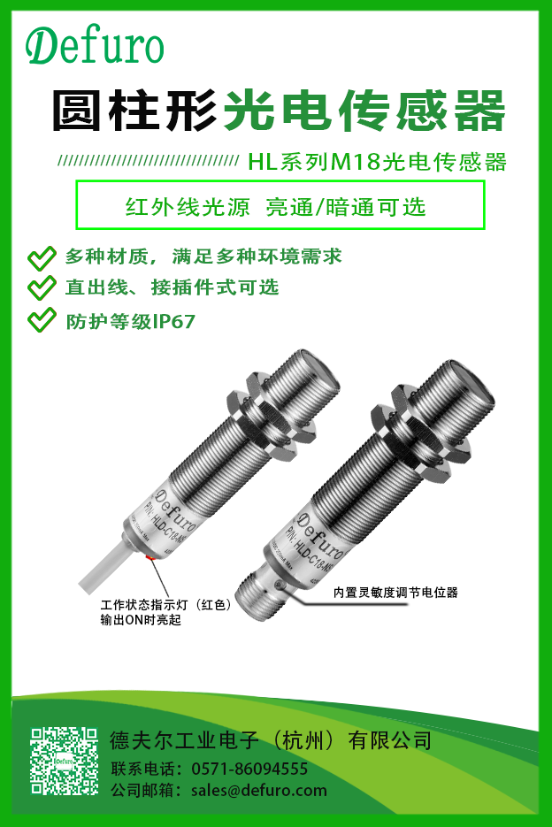 查看詳情>>德夫爾圓柱型M18光電傳感器是德夫爾推出的一款成本經(jīng)濟(jì)且實(shí)用的光電傳感器,外型為圓柱螺紋型,按檢測(cè)方式……